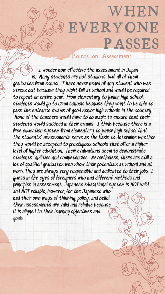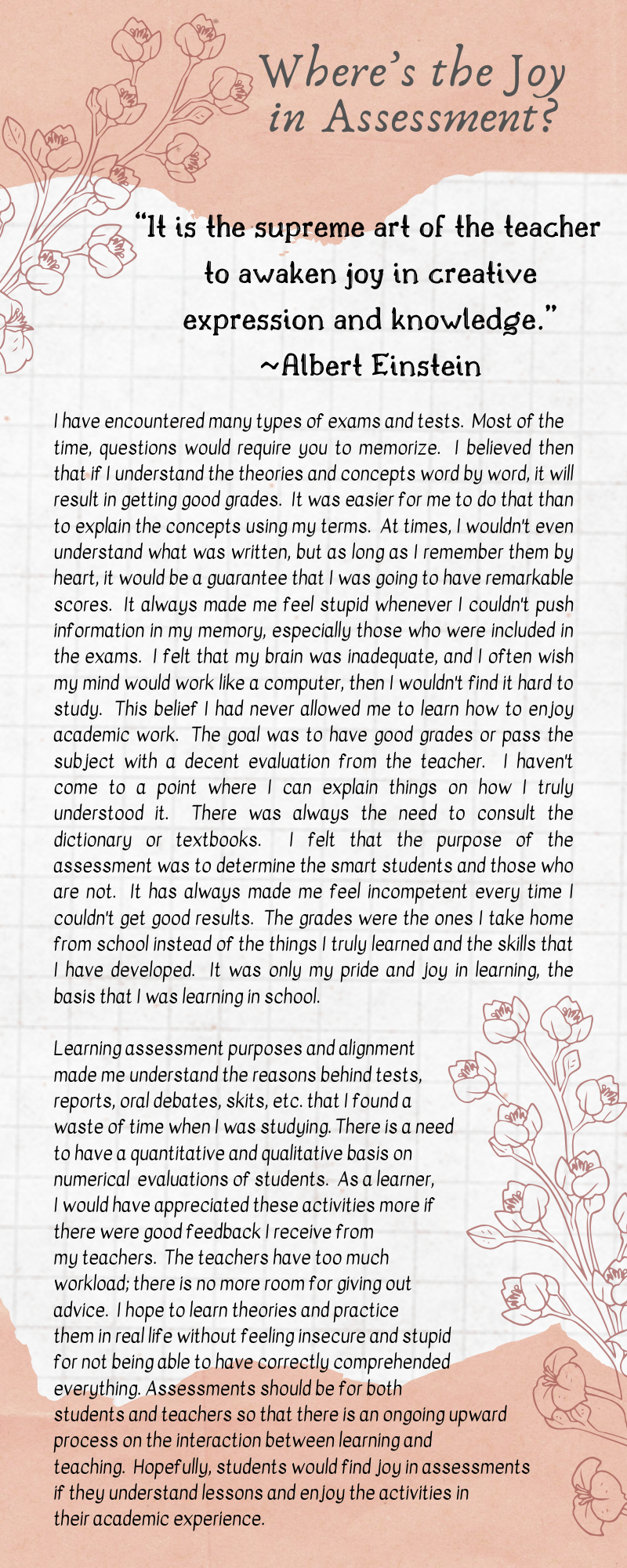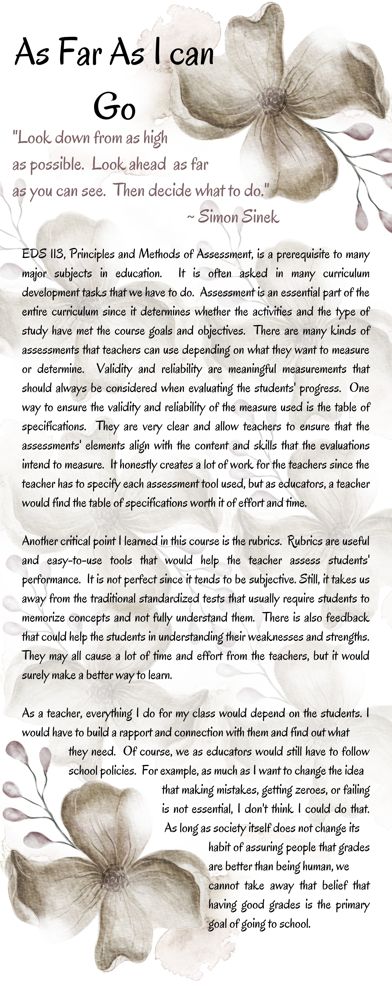 Feel free to read my simple thoughts about EDS 113 Principles and Methods of Assessment in Education. Happy learning.